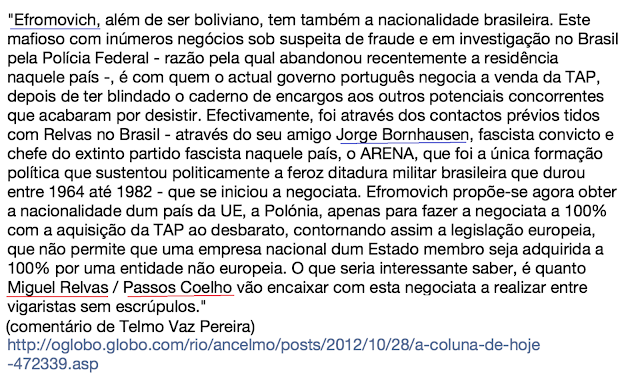 Mas nem um eventual insucesso deve preocupar Passos Coelho, pois mesmo derrotado tem emprego assegurado numa qualquer das empresas que já privatizou ou tenciona privatizar. Deixo aqui, desde já, algumas sugestões que Passos pode aproveitar. Por exemplo: electricista na EDP, ou na REN ou empregado de cabina na TAP. Ainda ponderei sugerir o lugar de piloto na TAP, ou o de gestor nalguma das empresas privatizadas, mas acho que tais cargos estão fora de questão, pois não se entregam cargos de chefia ou de gestão a quem já deu provas, enquanto primeiro-ministro, que não tem competência, nem perfil para o desempenho de tais cargos. Duvido mesmo que, perante a inábil actuação, o "padrinho" Ângelo Correia o aceite de volta.